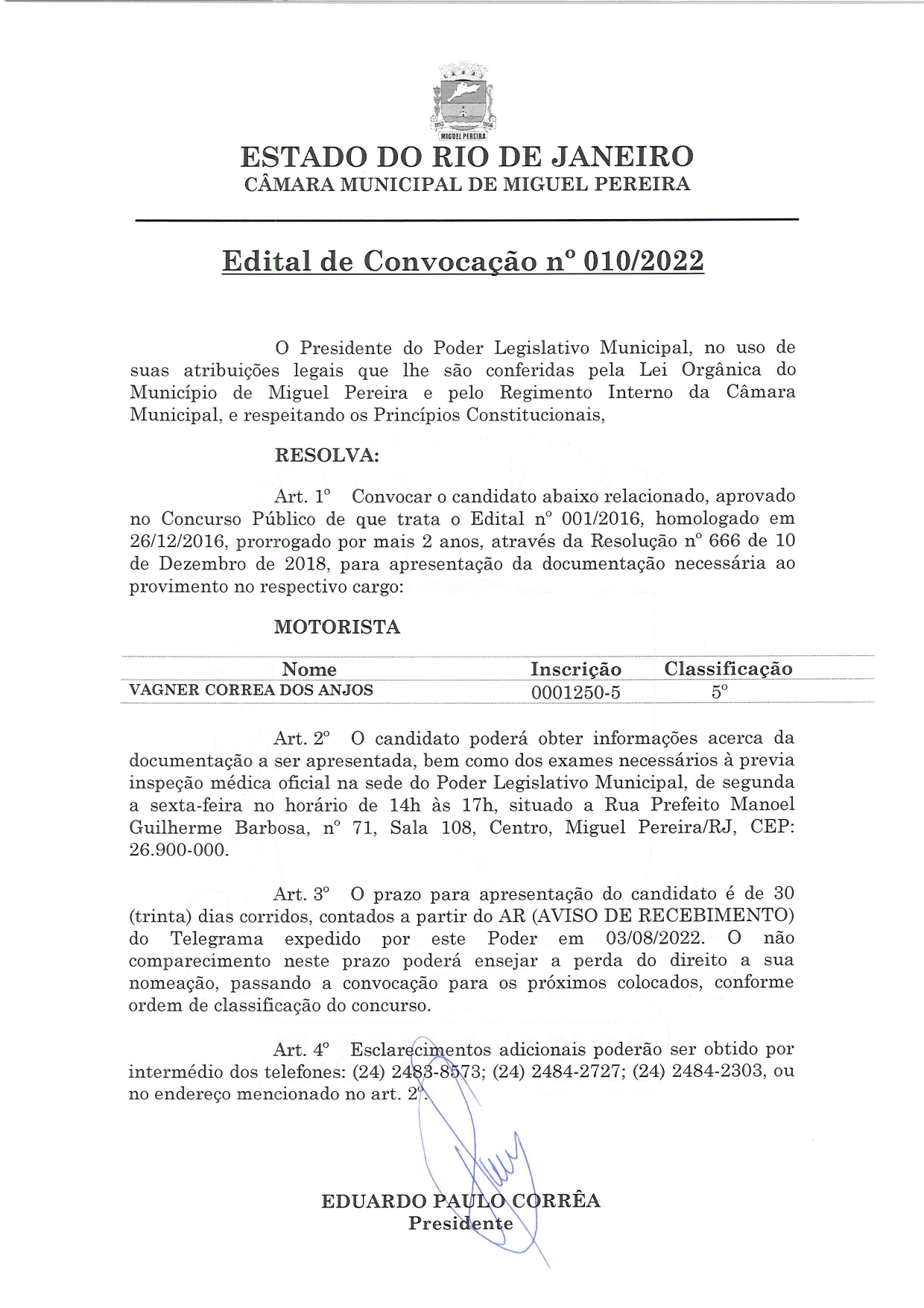 Edital de Convocação nº 010/2022 - Motorista
