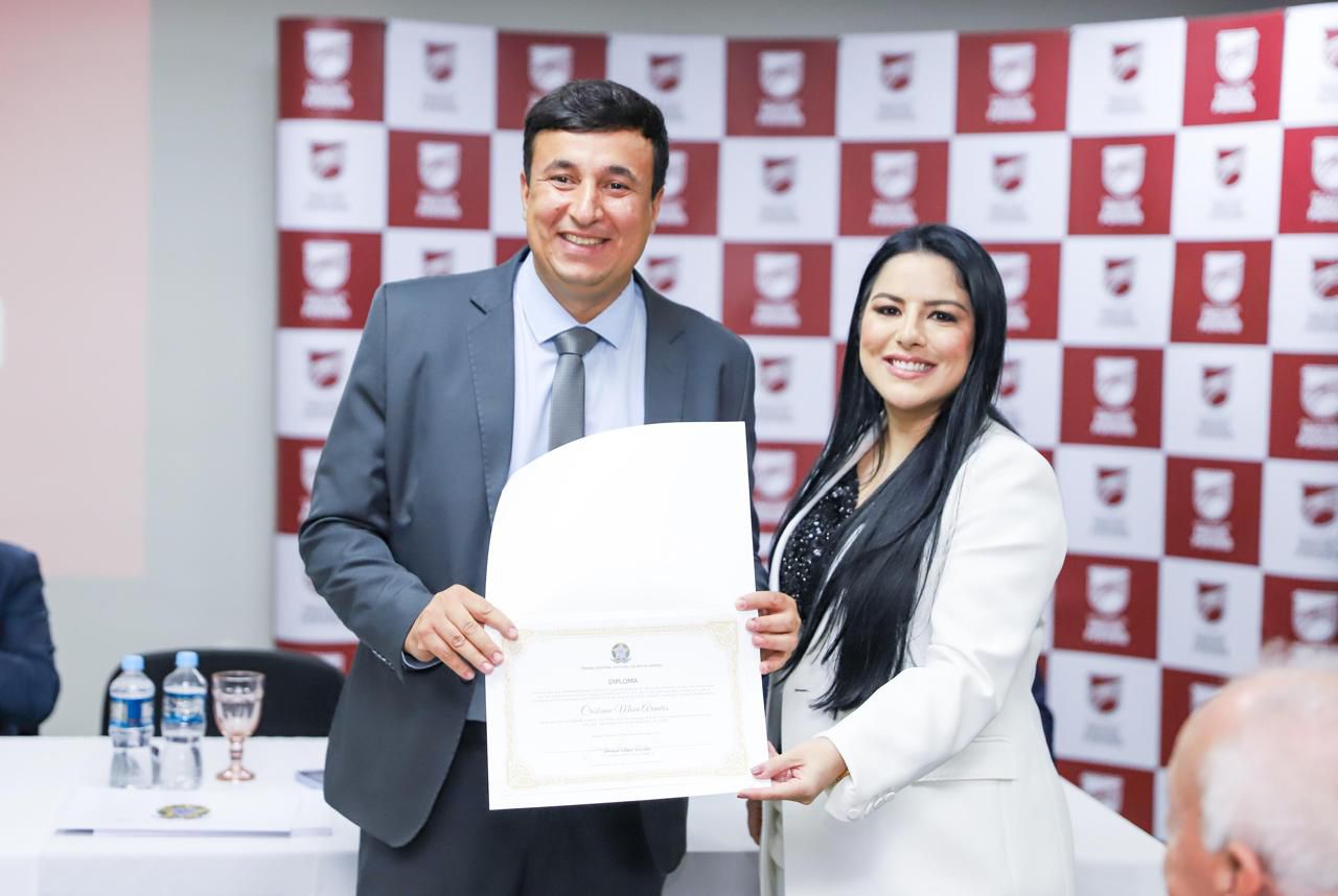 Vereador Kiki Família recebendo o diploma das mãos da Exma. Juíza Dra. Amanda.