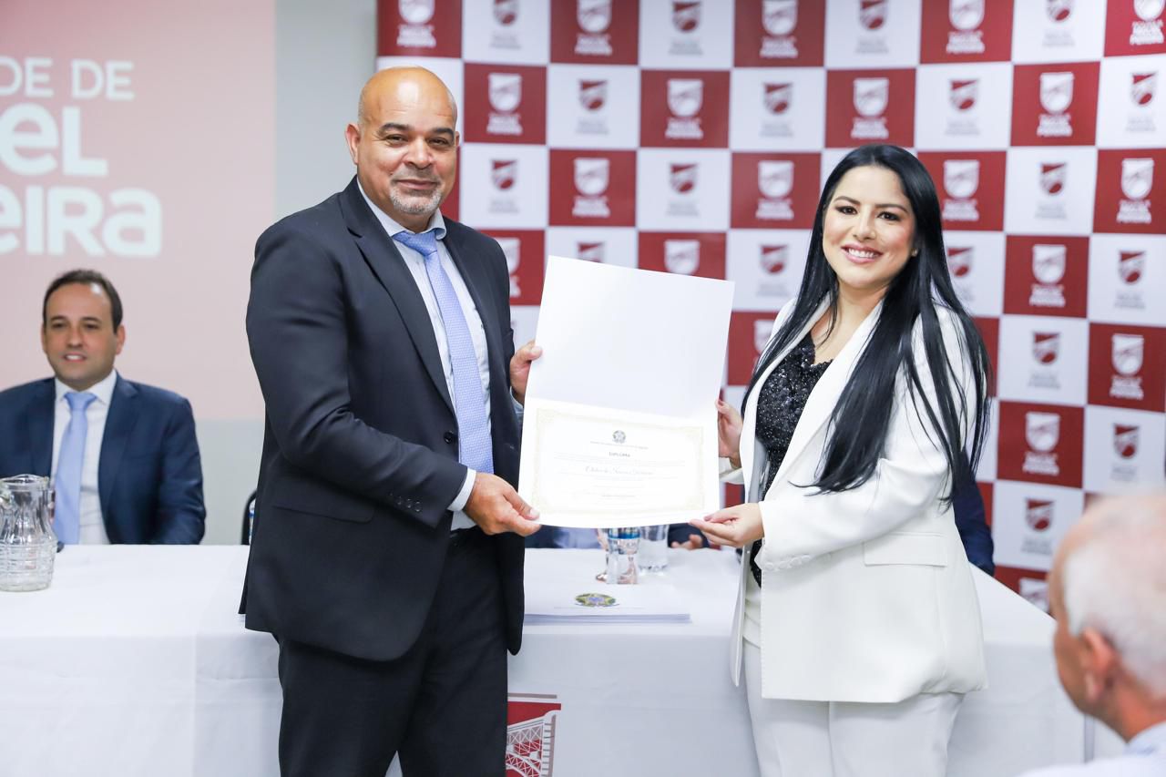 Vereador Cléber do Táxi recebendo o diploma das mãos da Exma. Juíza Dra. Amanda.