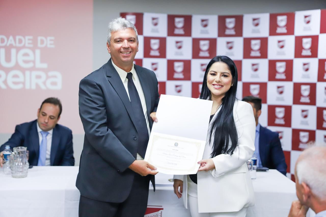 Vereador Mario Neves recebendo o diploma das mãos da Exma. Juíza Dra. Amanda.
